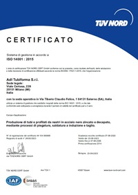 Questa certificazione è valida per le attività di produzione di tubi e profilati da nastri in acciaio nero zincato e decapato, mediante processi di piegatura, saldatura a induzione e taglio.